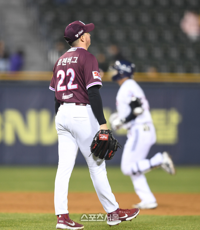 키움 선발투수 로젠버그가 3일 잠실야구장에서 열린 2025 KBO 리그 두산과 경기 4회말 상대 양석환에 홈런을 허용한 후 외야를 바라보고 있다.
