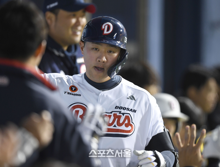 두산 양석환이 3일 잠실야구장에서 열린 2025 KBO 리그 키움과 경기 4회말 좌월홈런을 날린 후 동료들과 하이파이브를 하고 있다.