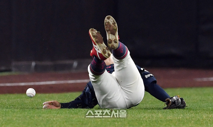 롯데 유격수 이호준이 3일 대전 한화생명 볼파크에서 열린 2025 KBO리그 한화와 경기 4회말 1사 한화 김태연의 뜬공을 놓치고 있다. 2025. 4. 3.