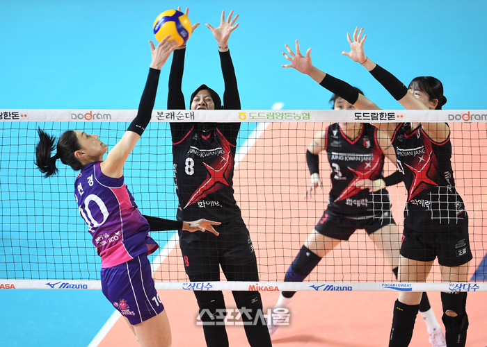 흥국생명 김연경(왼쪽)이 4일 대전 충무체육관에서 열린 2024-2025 V리그 여자부 정관장과의 챔피언결정전 3차전에서 스파이크 공격을 하고 있다. 2025. 4. 4.