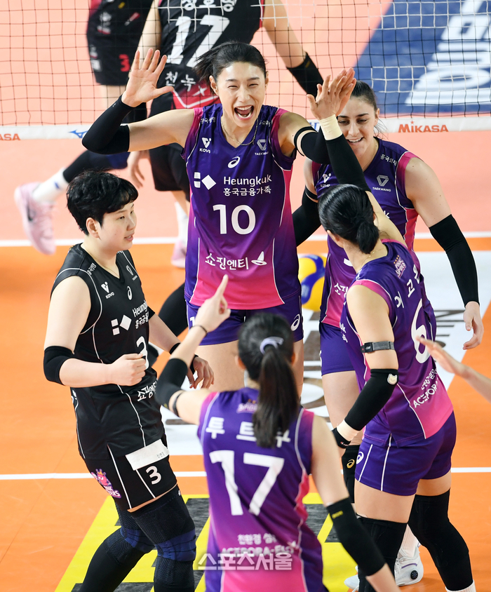 흥국생명 김연경(가운데이 4일 대전 충무체육관에서 열린 2024-2025 V리그 여자부 정관장과의 챔피언결정전 3차전에서 득점을 한 뒤 동료들과 함께 기뻐하고 있다. 2025. 4. 4.