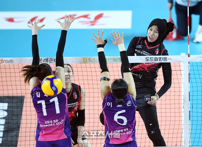 정관장 메가가 4일 대전 충무체육관에서 열린 2024-2025 V리그 여자부 흥국생명과의 챔피언결정전 3차전에서 스파이크 공격을 하고 있다. 2025. 4. 4.