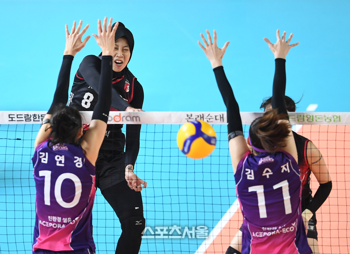정관장 메가(가운데)가 4일 대전 충무체육관에서 열린 2024-2025 V리그 여자부 흥국생명과의 챔피언결정전 3차전에서 스파이크 공격을 하고 있다. 2025. 4. 4.