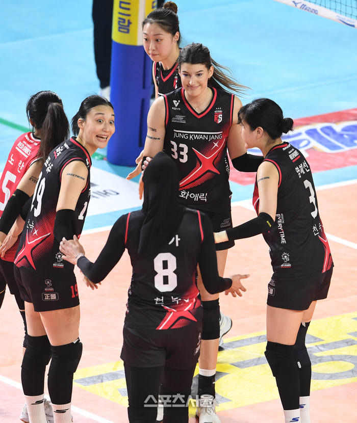 정관장 선수들이 4일 대전 충무체육관에서 열린 2024-2025 V리그 여자부 흥국생명과의 챔피언결정전 3차전에서 득점을 한 뒤 하이파이브를 나누고 있다. 2025. 4. 4.