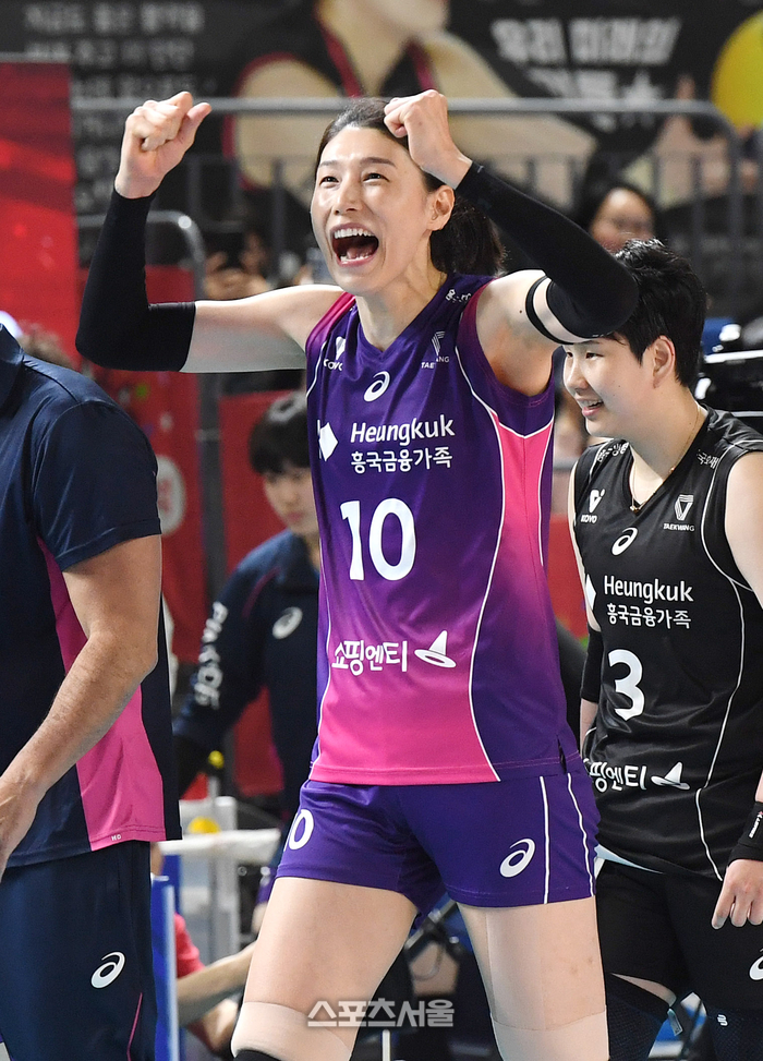 흥국생명 김연경이 4일 대전 충무체육관에서 열린 2024-2025 V리그 여자부 정관장과의 챔피언결정전 3차전에서 비디오 판독 끝에 2세트 승리를 확정하면서 포효하고 있다. 2025. 4. 4.