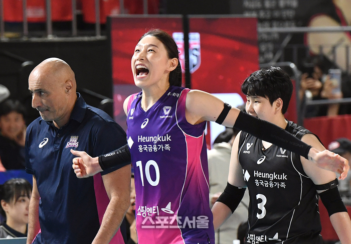 흥국생명 김연경(오른쪽)이 4일 대전 충무체육관에서 열린 2024-2025 V리그 여자부 정관장과의 챔피언결정전 3차전에서 비디오 판독 끝에 2세트 승리를 확정하면서 포효하고 있다. 왼쪽은 마르첼로 아본단자 감독. 2025. 4. 4.