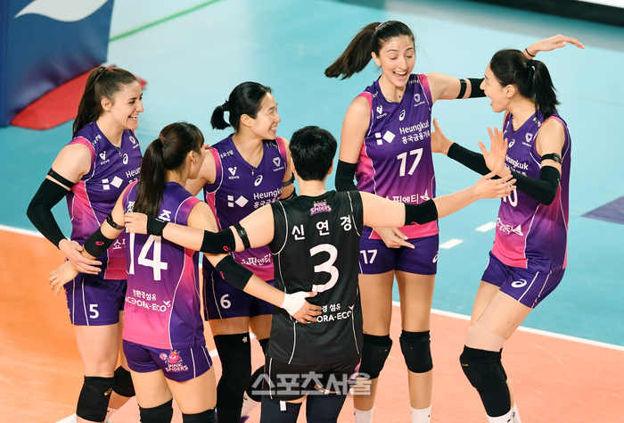 흥국생명 김연경(오른쪽이 4일 대전 충무체육관에서 열린 2024-2025 V리그 여자부 정관장과의 챔피언결정전 3차전에서 득점을 한 뒤 동료들과 함께 기뻐하고 있다. 2025. 4. 4.
