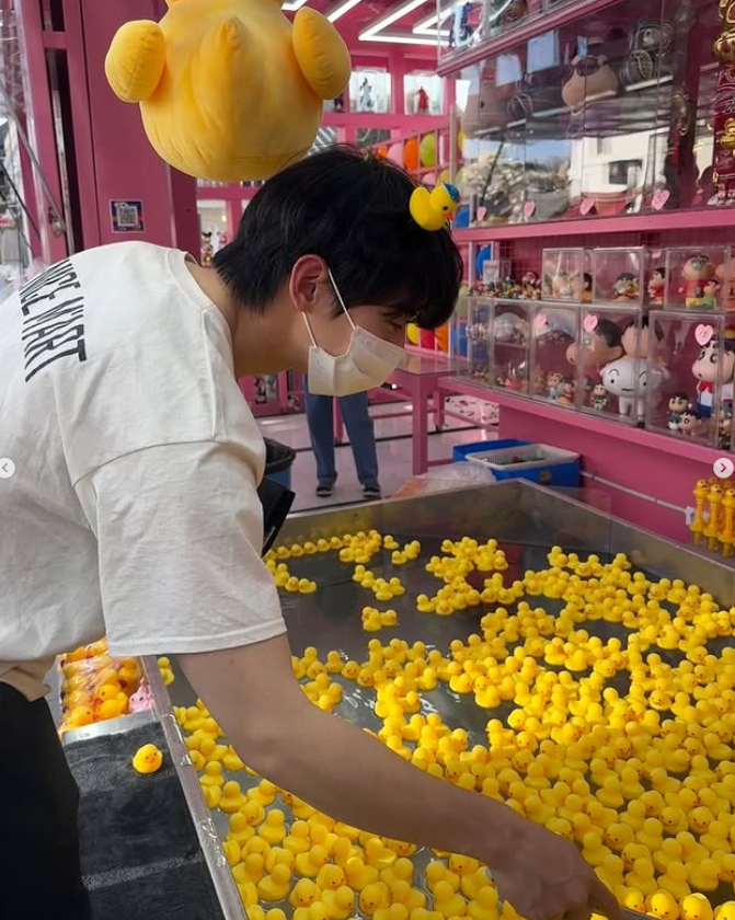 다른 사진에서는 다양한 인형들이 진열된 상점에서 작은 인형을 손에 들고 있는 모습으로, 그의 소탈하고 친근한 매력이 돋보인다.