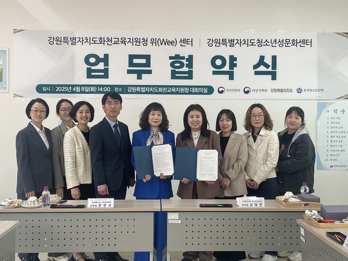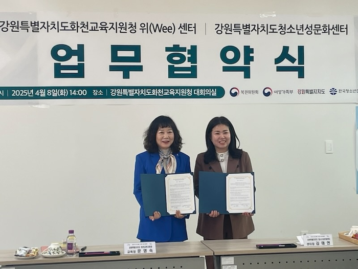 [스포츠서울ㅣ김기원기자]강원특별자치도화천교육지원청(교육장 문영숙)은 4월 8일(화) 14시 화천교육지원청 대회의실에서 강원특별자치도청소년성문화센터와 청소년 성 보호 및 위기 대응 강화를 위한 업무협약을 체결했다.
