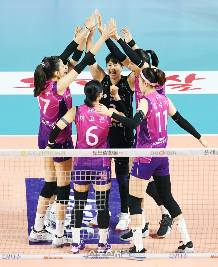 흥국생명 김연경(오른쪽)이 8일 인천 삼산월드체육관에서 열린 2024-2025 V리그 여자부 정관장과의 챔피언결정전 5차전에서 정관장 메가의 공격을 블로킹 하며 득점한 뒤 동료들과 함께 기뻐하고 있다. 2025. 4. 8.