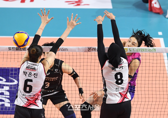 흥국생명 김연경(오른쪽)이 8일 인천 삼산월드체육관에서 열린 2024-2025 V리그 여자부 정관장과의 챔피언결정전 5차전에서 스파이크 공격을 하고 있다. 2025. 4. 8.
