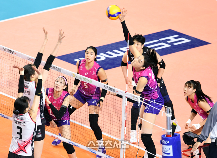 흥국생명 김연경(오른쪽)이 8일 인천 삼산월드체육관에서 열린 2024-2025 V리그 여자부 정관장과의 챔피언결정전 5차전에서 스파이크 공격을 하고 있다. 2025. 4. 8.