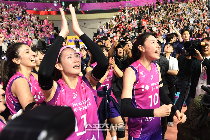 흥국생명 김연경(오른족)이 8일 인천 삼산월드체육관에서 열린 2024-2025 V리그 여자부 정관장과의 챔피언결정전 5차전에서 정관장을 꺾고 통합 우승을 차지한 뒤 김수지와 함께 기뻐하고 있다. 2025. 4. 8.