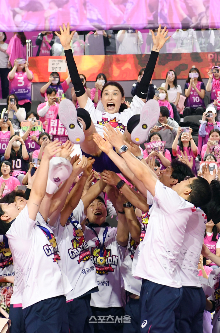 흥국생명 김연경(가운데)이 8일 인천 삼산월드체육관에서 열린 2024-2025 V리그 여자부 정관장과의 챔피언결정전 5차전에서 정관장을 꺾고 통합 우승을 차지한 뒤 헹가래를 받고 있다. 2025. 4. 8.