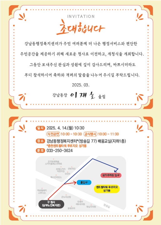 [스포츠서울ㅣ춘천=김기원기자]“강남동행정복지센터 이전 개청식에 초대합니다”