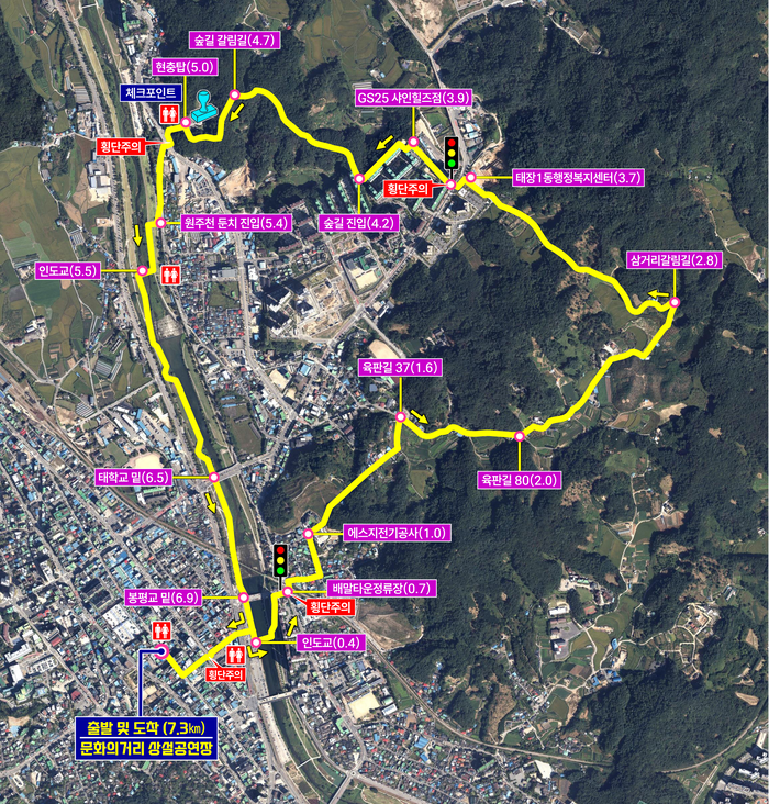 4월 대회 코스는 문화의거리 상설공연장에서 출발해 육판마을길로 방향을 잡아 숲길과 현충탑을 지난 뒤 원주천을 따라 원점으로 돌아오는 7.3㎞ 구간으로 운영된다.