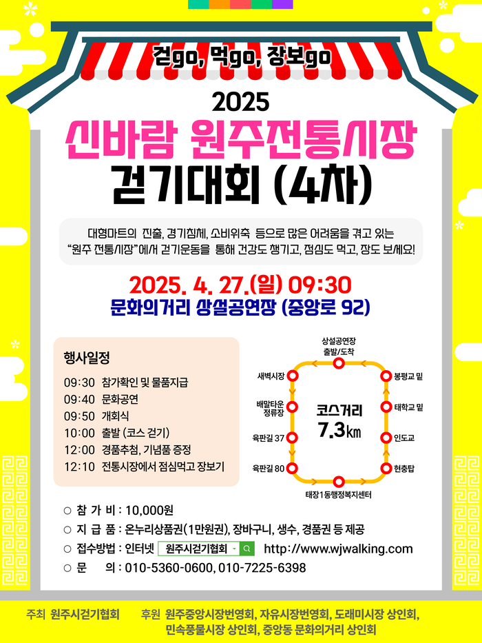[스포츠서울ㅣ원주=김기원기자]깊어지는 봄의 정취를 느낄 수 있는 오는 4월 27일, 2025 신바람 원주전통시장 걷기대회 4차 행사가 원주시 중앙동 문화의거리 상설공연장에서 개최된다.
