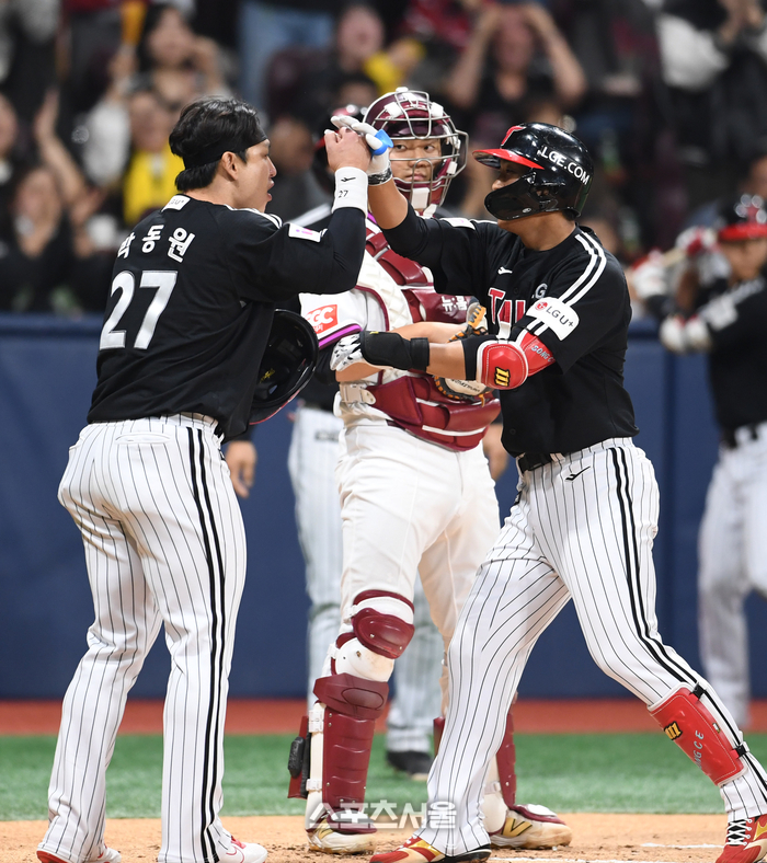 LG 송찬의(오른쪽)가 10일 고척스카이돔에서 열린 2025 KBO리그 키움과의 경기 2회초 1사 1-2루 상황에서 키움 선발 하영민을 상대로 3점 홈런을 친 뒤 박동원과 하이파이브를 하고 있다. 송찬의의 시즌 2호 홈런. 2025. 4. 10.