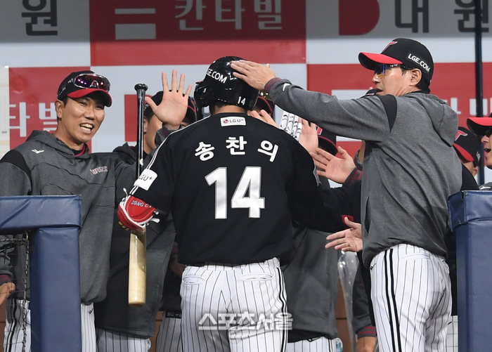 LG 송찬의(가운데)가 10일 고척스카이돔에서 열린 2025 KBO리그 키움과의 경기 2회초 1사 1-2루 상황에서 키움 선발 하영민을 상대로 3점 홈런을 친 뒤 염경엽 감독 등 코칭스태프와 하이파이브를 하고 있다. 송찬의의 시즌 2호 홈런. 2025. 4. 10.