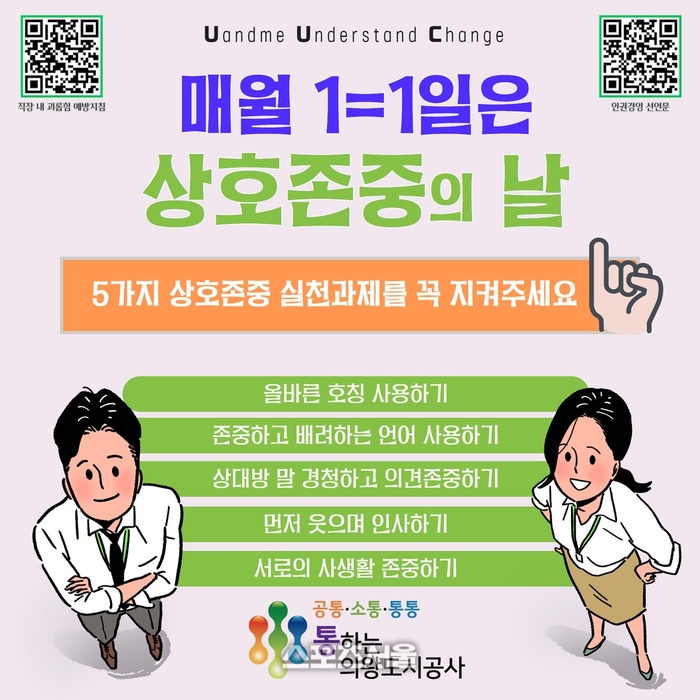 〔스포츠서울│의왕=좌승훈기자〕의왕도시공사는 직장 내 존중과 배려의 문화를 정착시키기 위해 매월 11일을 ‘상호 존중의 날’로 지정해 운영한다.