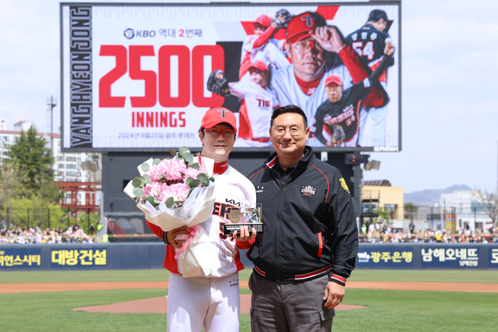 KIA는 12일 광주 SSG전에 앞서 베테랑 투수 양현종의 2500이닝 투구 달성을 기념하는 시상식을 진행했다.