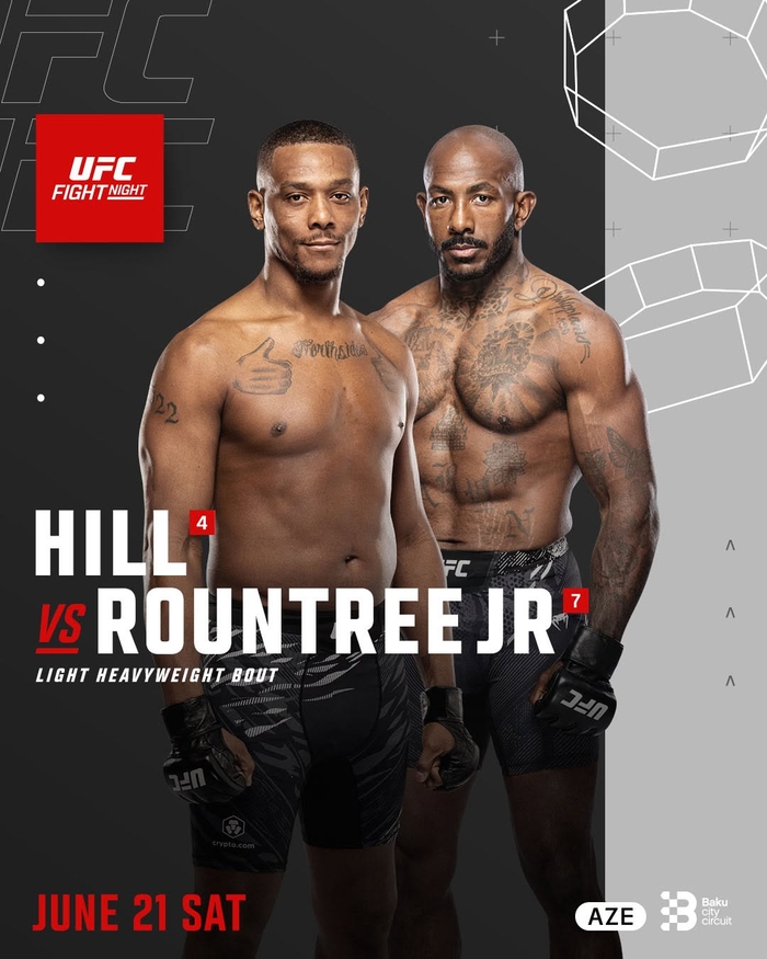 12승 3패 1무효의 전적을 가지고 있는 힐은 빠르게 복귀해 올해 벌써 두 번째 경기에 나선다. 힐은 최초의 데이나 화이트의 컨텐더 시리즈(DWCS) 출신 UFC 챔피언으로 티아고 산토스, 조니 워커, 지미 크루트를 꺾고 타이틀 도전권을 얻었다. 힐이 라운트리 주니어를 맞아 인상적인 경기력을 보여주면 타이틀샷도 가능하다.