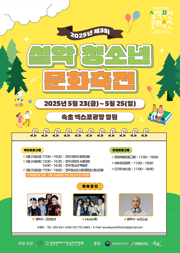 이번 설악무산문화축전은 오는 5월 23일부터 25일까지 3일간 속초시 엑스포 잔디광장 일원에서 개최된다. (재)설악·만해사상실천선양회가 주최·주관하며 문화체육관광부, 강원특별자치도, 속초시가 어린이와 청소년의 문화예술 증진을 위해 힘을 보태, 대상자들을 위한 다양한 프로그램으로 구성된다.