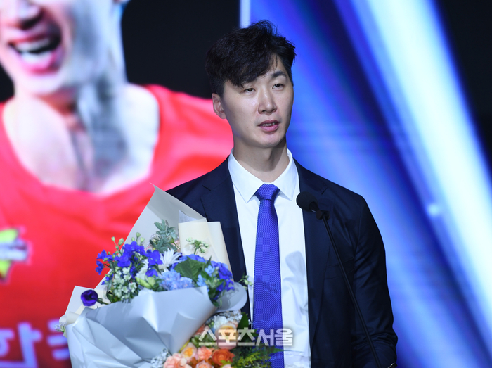 박철우가 14일 서울 서대문구 스위스 그랜드 호텔에서 열린 2024~2025 V-리그 시상식에서 20주년 베스트7로 선정된 후 소감을 밝히고 있다.