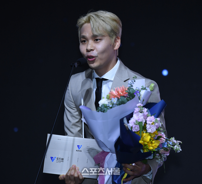남자부 베스트7 리베로 부문 수상자인 KB손해보험 정민수가 14일 서울 서대문구 스위스 그랜드 호텔에서 열린 2024~2025 V-리그 시상식에서 소감을 밝히고 있다.