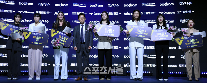 여자부 베스트7 한국도로공사 임명옥, 정관장 염혜선, 흥국생명 피치, 현대건설 이다현, 흥국생명 김연경, 정관장 부키리치(곽선옥 대리수상), GS칼텍스 실바(이지언 대리수상)이 14일 서울 서대문구 스위스 그랜드 호텔에서 열린 2024~2025 V-리그 시상식에서 기념촬영을 하고 있다.