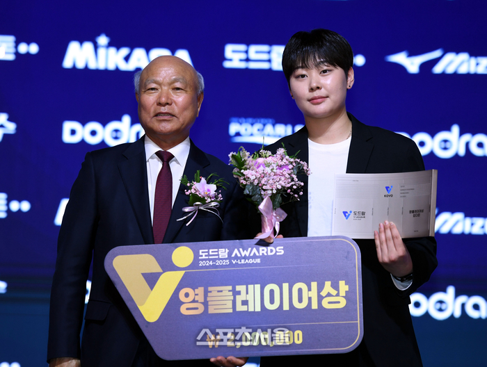여자부 영플레이어상 한국도로공사 김다은이 14일 서울 서대문구 스위스 그랜드 호텔에서 열린 2024~2025 V-리그 시상식에서 박광욱 도드람양돈농협 조합장과 기념촬영을 하고 있다.