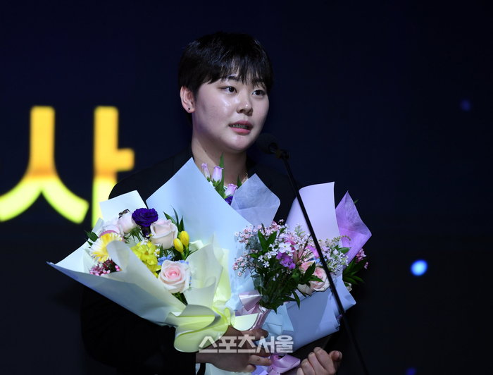 여자부 영플레이어상 한국도로공사 김다은이 14일 서울 서대문구 스위스 그랜드 호텔에서 열린 2024~2025 V-리그 시상식에서 소감을 밝히고 있다.