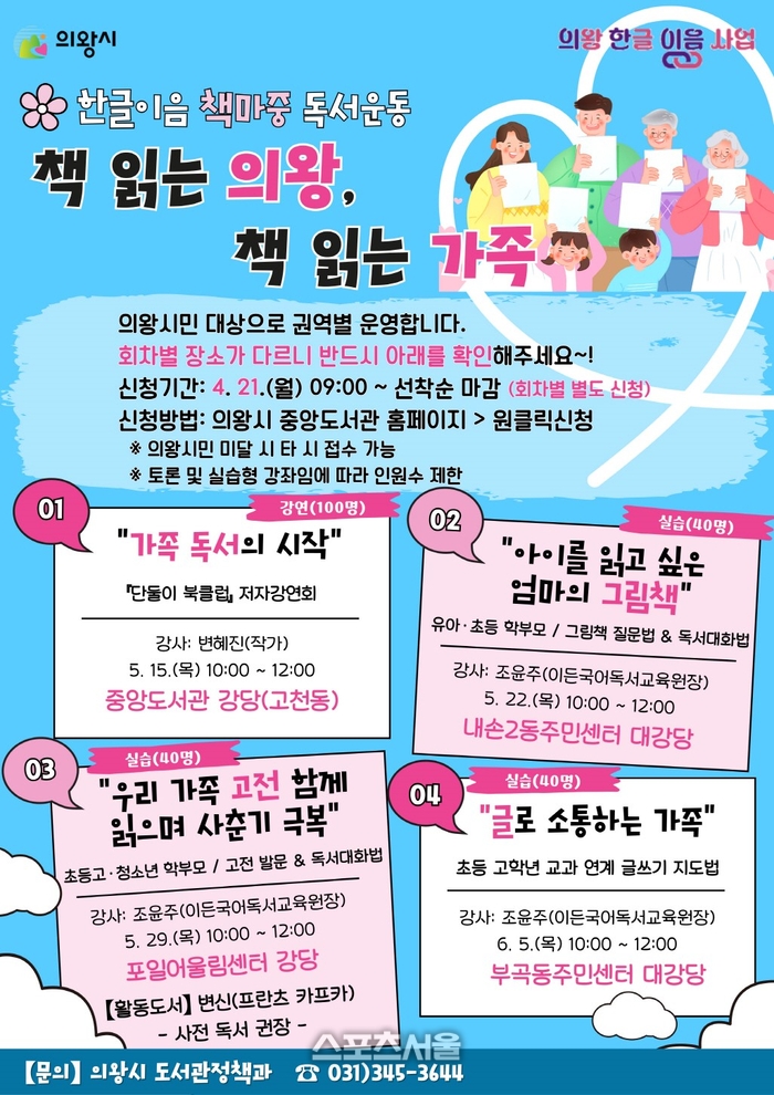 〔스포츠서울│의왕=좌승훈기자〕경기 의왕시는 5월 가족의 달을 맞아 ‘의왕 한글 이음 사업’의 하나로 ‘책 읽는 의왕, 책 읽는 가족’을 운영한다고 16일 밝혔다.