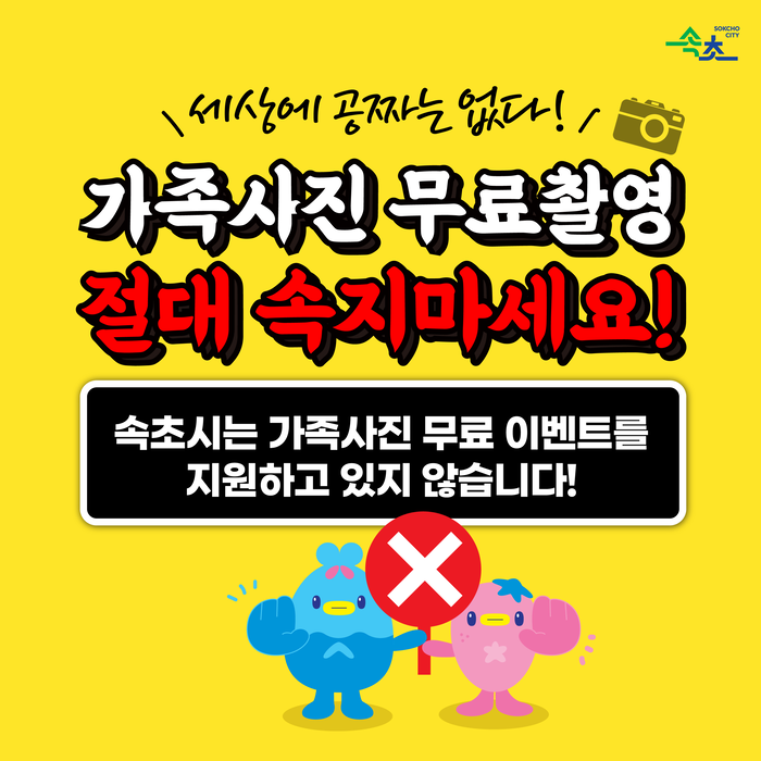 속초시는 SNS상 시민 대상 무료 가족사진 촬영 등 관련 이벤트를 지원하고 있지 않다. 속초시 관련 행사 또는 이벤트는 속초시 공식 SNS를 통해 직접 홍보하고 있으며, 속초시와 관련 있는 것처럼 보이는 사례와 같은 광고도 시와는 관련이 없는 만큼 시민들의 주의가 필요하다.