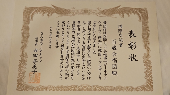 백세합창단은 ‘뛰어난 음악적 역량을 과시하고, 국제적 음악 교류에 기여한 단체’로 선정되어 상장과 함께 상금 10만엔을 수상했다.