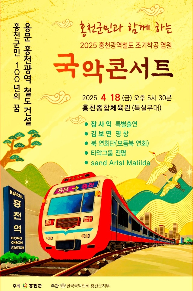 [스포츠서울ㅣ김기원기자]홍천군민들의 100년 염원인 용문-홍천 광역철도 조기착공을 염원하는 홍천 국악콘서트가 18일 홍천종합체육관에서 오후 5시 30분부터 1,2부 무료 공연으로 개최된다.
