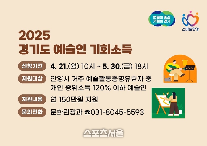 〔스포츠서울│안양=좌승훈기자〕경기 안양시는 ‘경기도 예술인 기회소득’사업에 참여할 대상자를 오는 21일 오전 10시부터 5월 30일 오후 6시까지 모집한다고 18일 밝혔다.