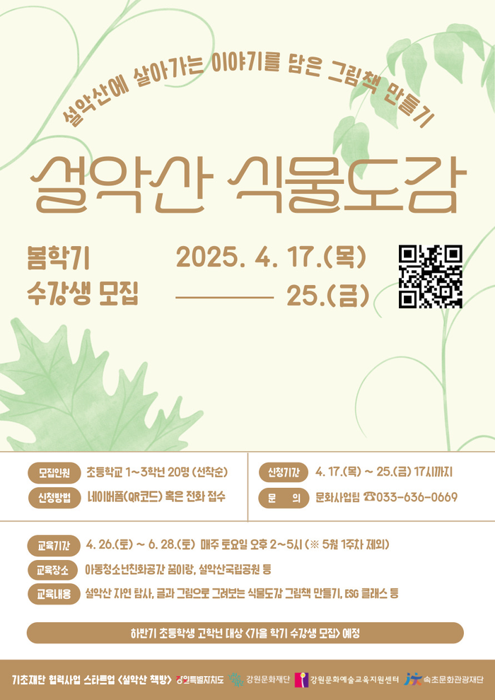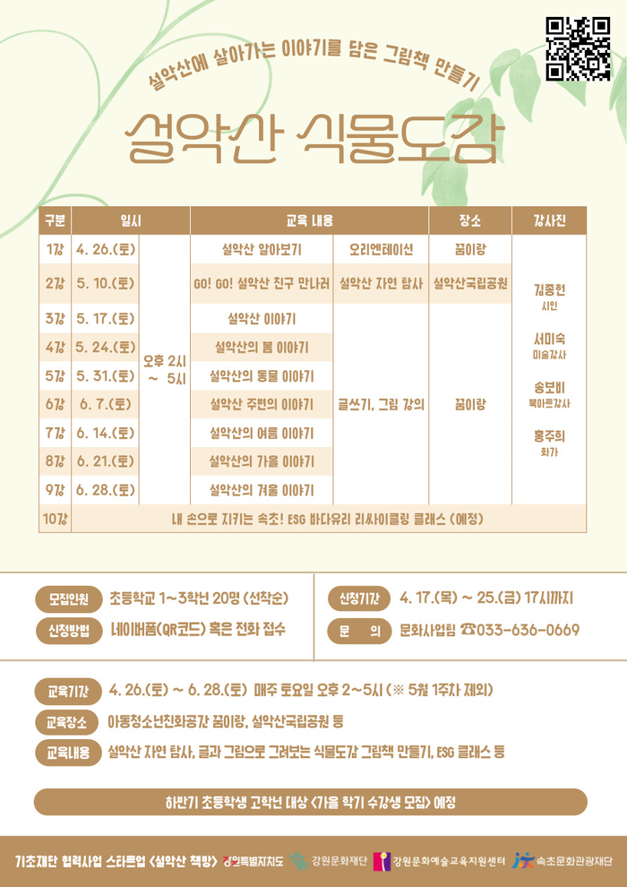 설악산 식물도감은 수준별 맞춤형 문화예술 교육을 위해 봄학기에는 초등 저학년을, 가을학기에는 고학년을 대상으로 나누어 진행된다. 이 중, 봄학기는 4월 26일부터 6월 28일까지 총 10회에 걸쳐 운영된다.