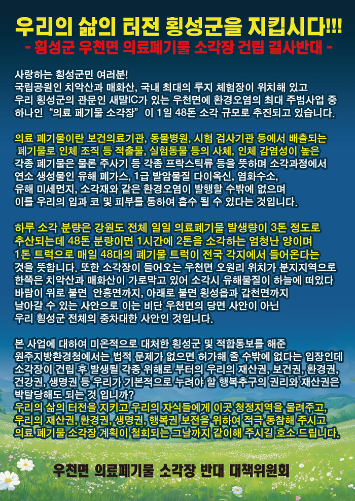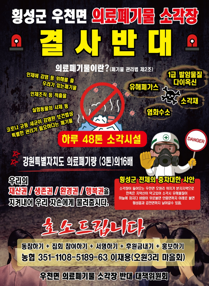 지역 주민들은 의료폐기물을 소각하며 나오는 다이옥신 등 1급 발암물질과 폐가스, 2차 감염의 위험성이 있는 유해 물질 등이 분지지형인 우천면 오원리에서 횡성군 전역으로 퍼질 우려가 있다는 점에서 소각장 건립계획이 철회되는 그 날까지 총력 투쟁한다는 입장이다.