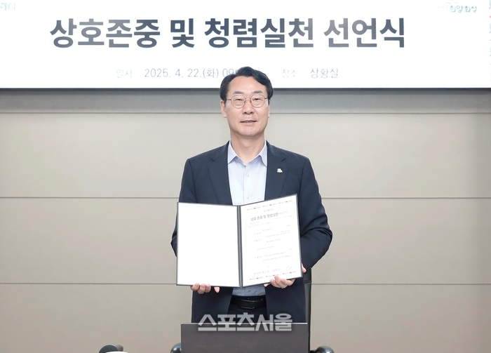 〔스포츠서울│화성=좌승훈기자〕정명근 화성특례시장은 22일 시청 상황실에서 고위직 공무원과 공직 유관단체장이 참석한 가운데 열린 ‘상호존중 및 청렴실천 선언식’에서 “청렴실천 의지를 대내외에 공표함으로써, 적극적인 관심과 노력을 통해 상호존중과 청렴 문화를 정착시켜 시민에게 신뢰받는 특례시를 만들겠다”고 강조했다.
