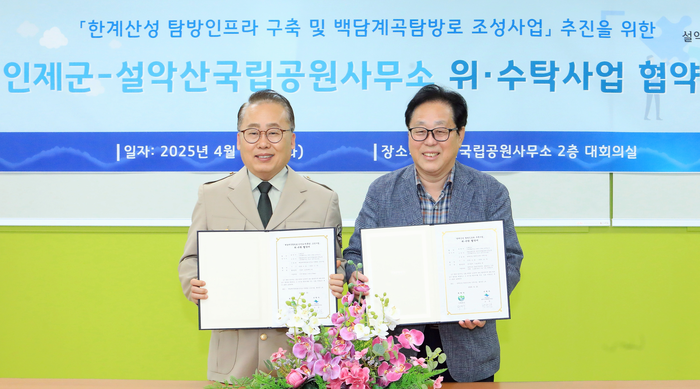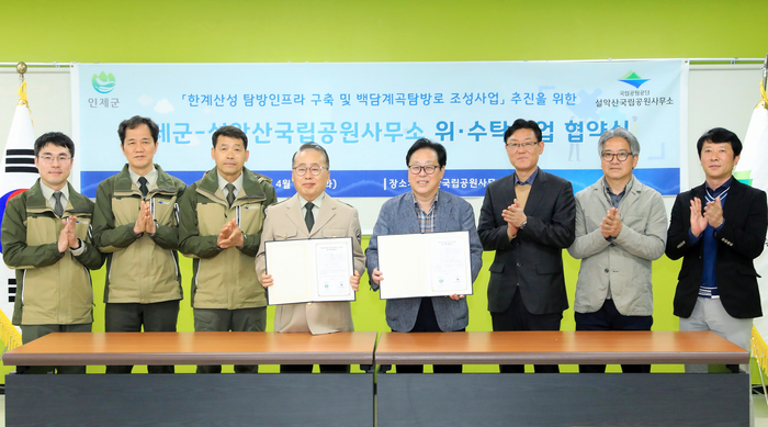 [스포츠서울ㅣ김기원기자]인제군과 설악산국립공원사무소는 4월 22일 설악산국립공원사무소에서 ‘설악권 중점 현안사업 공기관 위‧수탁 협약식’을 개최했다.