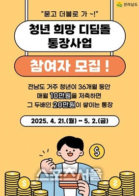 [스포츠서울|조광태기자] 전라남도는 오는 5월 2일까지 ‘2025년 청년 희망디딤돌 통장’ 사업의 신규 참여자를 모집하고, 적격심사를 거쳐 7월 총 825명을 최종 선정할 계획이라고 밝혔다.