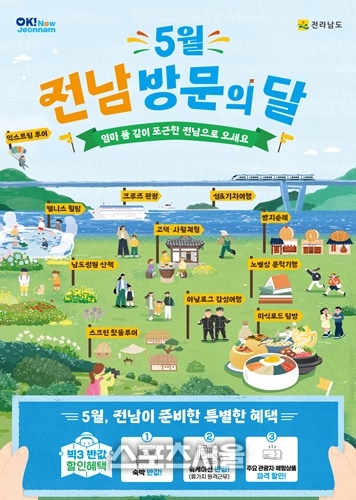 유현호 전남도 관광체육국장은 “각종 사고와 경기침체 등으로 어려운 관광업계를 지원하고 지역경제 활성화에도 힘을 보태기 위해 ‘5월 전남 방문의 달’을 운영하게 됐다”며 “5월 여행은 ‘전남 방문의 달’로 준비한 풍성한 혜택, 매력적인 관광상품과 함께 어머니 품 전남에서 즐거운 시간 보내길 바란다”고 말했다.