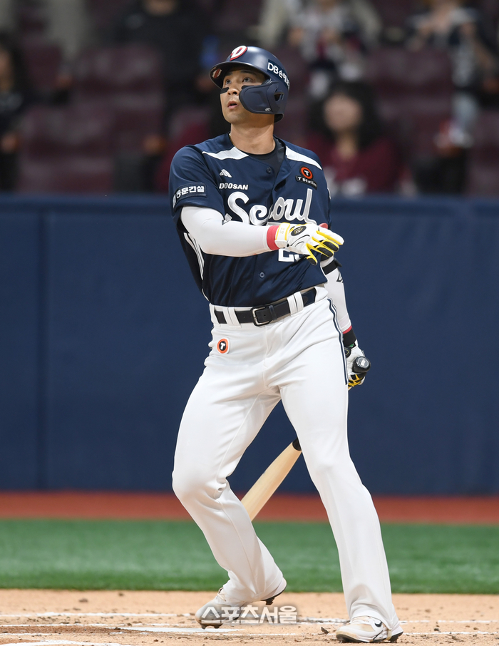 두산 강승호가 24일 서울 고척스카이돔에서 열린 2025 KBO리그 키움과 경기 2회초 타구를 바라보고 있다. 좌익수 플라이 아웃.