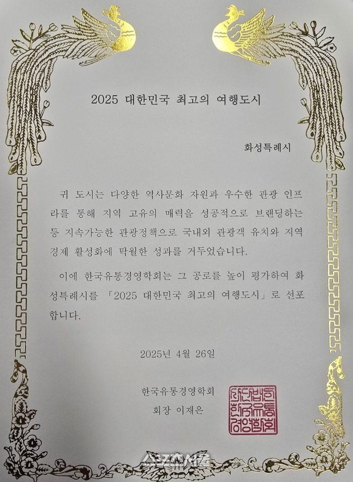 〔스포츠서울│화성=좌승훈기자〕(사)한국유통경영학회는 ‘대한민국 최고 여행도시’로 경기 화성시를 선정했다.