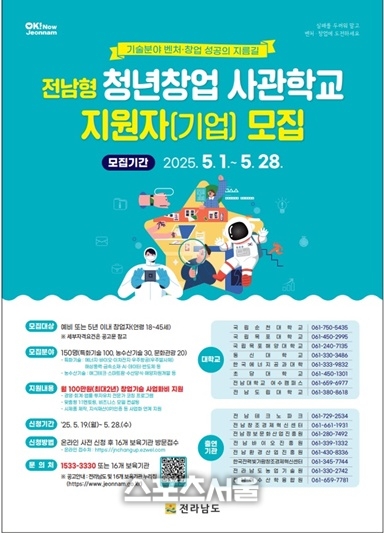 [스포츠서울|조광태기자] 전라남도는 대학생과 청년을 중심으로 지역 벤처창업 기반을 다지고, 미래 첨단분야 우수기술 창업을 유인하기 위해 광역자치단체 최초로 ‘전남형 청년창업사관학교’를 운영키로 하고, 지원자(기업)를 5월 28일까지 모집한다.