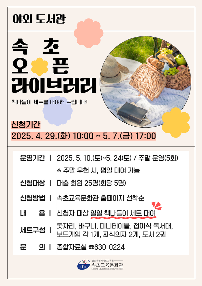 신청 기간은 4월 29일(화) 10시부터 5월 7일(금) 17시까지이며, 자세한 사항은 속초교육문화관 누리집 공지사항(https://lib.gwe.go.kr/sokecc)을 참고하거나 종합자료실(☎ 630-0224)로 문의하면 된다.