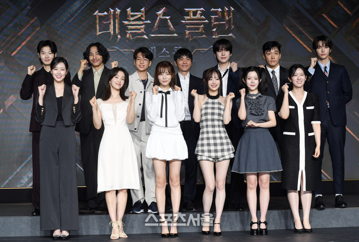 29일 서울 마포구 호텔 나루 서울 엠겔러리에서 진행된 넷플릭스 ‘데블스 플랜:데스룸’ 제작발표회에서 출연자들이 취재진을 향해 포즈를 취하고 있다. 윗줄 왼쪽부터 모델 최현준, 유튜버 티노, 대학생 박상연, 전 프로 바둑기사 이세돌, 가수 규현, 포커 플레이어 세븐하이, 대학생 정현규. 아랫줄 왼쪽부터 미스코리아 출신 대학생 이승현, 아나운서 강지영, 배우 윤소희, 가수 츄, 의사 김하린, 변호사 손은유. 2025. 4. 29.