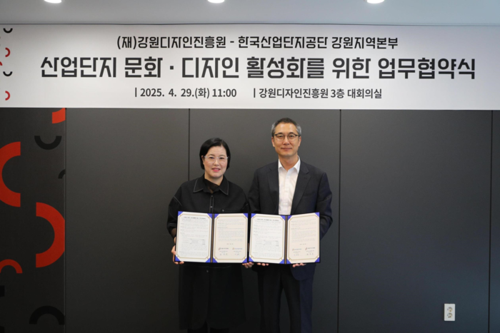 [스포츠서울ㅣ춘천=김기원기자](재)강원디자인진흥원(원장 최인숙, 이하 진흥원)과 한국산업단지공단 강원지역본부(본부장 이규헌)는 4월 29일 강원디자인진흥원 대회의실에서 산업단지 내 문화·디자인 활성화를 위한 업무협약(MOU)을 체결했다.