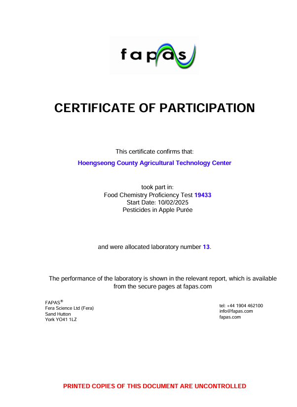 횡성군은 FAPAS에 12개 농약 성분 분석값에 대해 모두‘만족’평가를 받아 6년 연속으로 우수성을 입증했다.